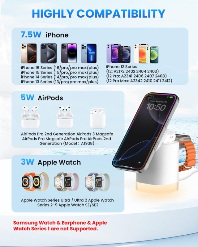 The stand is compatible with iPhone 15-12 series, Apple Watch Ultra 2, Ultra, Series 9-2, SE, and AirPods Pro 2, Pro, 3, 2.
