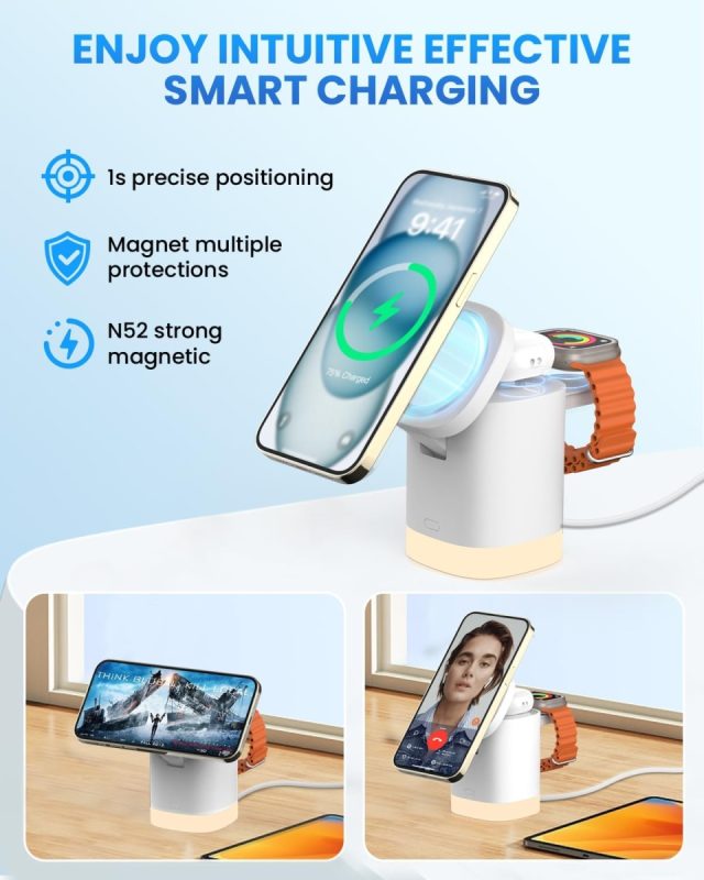 The JoyGeek 3-in-1 Charger Stand for MagSafe is a convenient wireless charging station that lets you charge your iPhone (12–16 series), AirPods (2–4), and Apple Watch (Series 2–10/Ultra) all at once. It uses strong magnets to keep your phone in place, making charging easy and reliable. The stand is foldable and lightweight, so it’s great for travel or keeping your desk tidy.It also features an adjustable night light with three settings, which is useful for bedside use. The build quality is sturdy, with a mix of metal arms and a plastic body that feels solid and not cheap. Users like that it reduces cable clutter and that the indicator lights turn off after a few seconds, so they won’t disturb you at night. Charging speed is decent—good for everyday use, but not the fastest available.Most people find it to be good value for the price, especially since it includes a wall charger and cable. However, some users have noted that the charging cable could be longer, and a few have experienced issues with long-term durability. Also, if your Apple Watch has a thick case, you may need to remove it for reliable charging