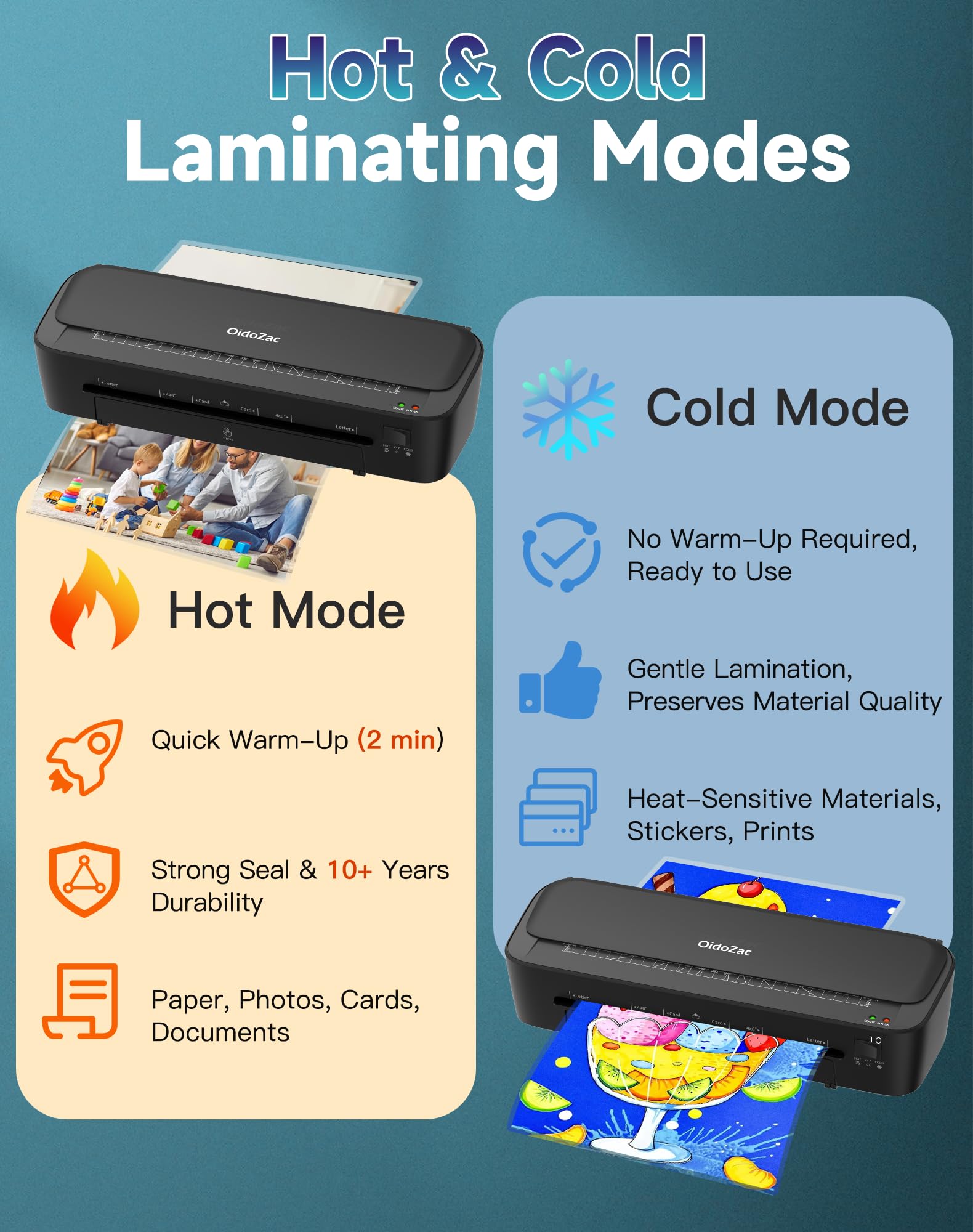 - Two temperature modes for versatile laminating options.