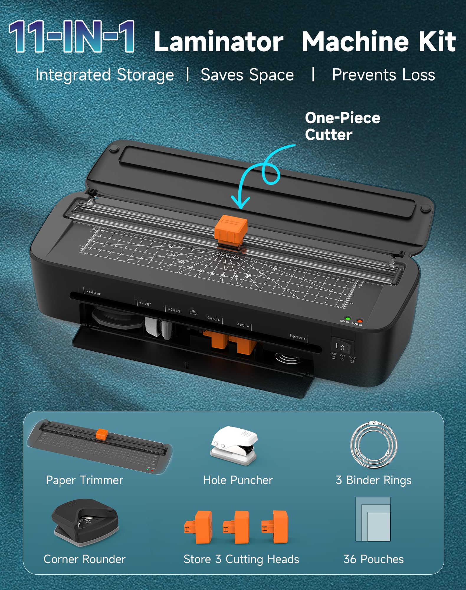 The laminator comes with a built-in trimmer, corner rounder, hole puncher, and three paper cutting heads, along with 36 laminating pouches to get you started right away.