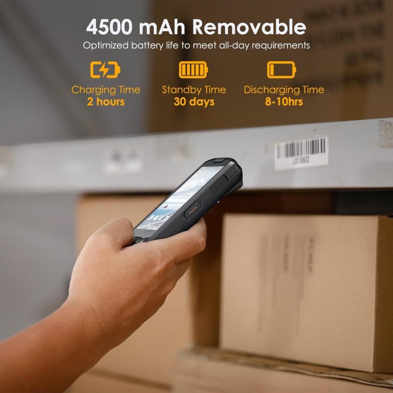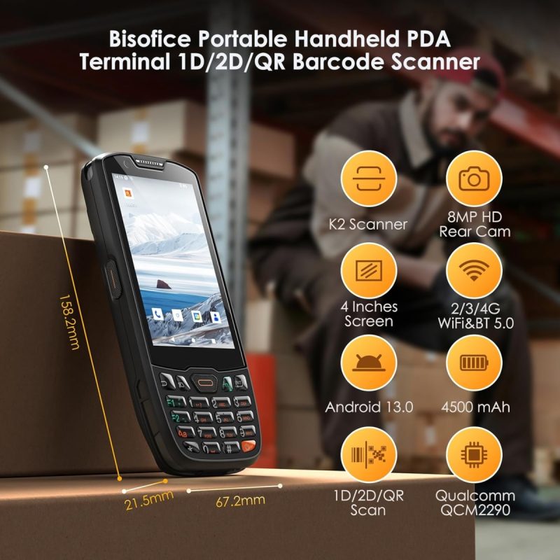 Limited stock – order now The regular price is £129.99, but it’s currently on sale for £59.99, saving you £70.00 (54%). The Bisofice 2025 Barcode Scanner Android is designed for high-performance applications. It runs on the latest Android 13 operating system and is powered by a Qualcomm QCM2290 quad-core 2.0G processor. With 4G+64GB memory, it allows users to navigate seamlessly and improve work efficiency, making it an excellent choice for inventory management and retail environments. This device features exceptional decoding capabilities, accurately reading various barcode formats, including PDF417, QR Code, and Data Matrix, among others. The advanced K2 scanning head enhances its functionality in demanding conditions, ensuring reliable performance in warehouses or retail services. With robust connectivity options, including 2G, 3G, and 4G support along with dual-band Wi-Fi and Bluetooth 5.0, it ensures stable communication and data transmission, catering to diverse operational needs.