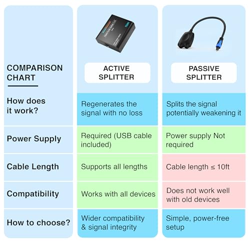 I purchased a passive splitter prior to getting this from a different manufacturer, but I experienced lots of drop outs in the audio. Bought the active version of this model and it has solved the issue. One star removed because it doesn’t have an off switch.