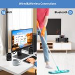 - Connect the speakers to your computer or other devices using the provided auxiliary cable or via Bluetooth.