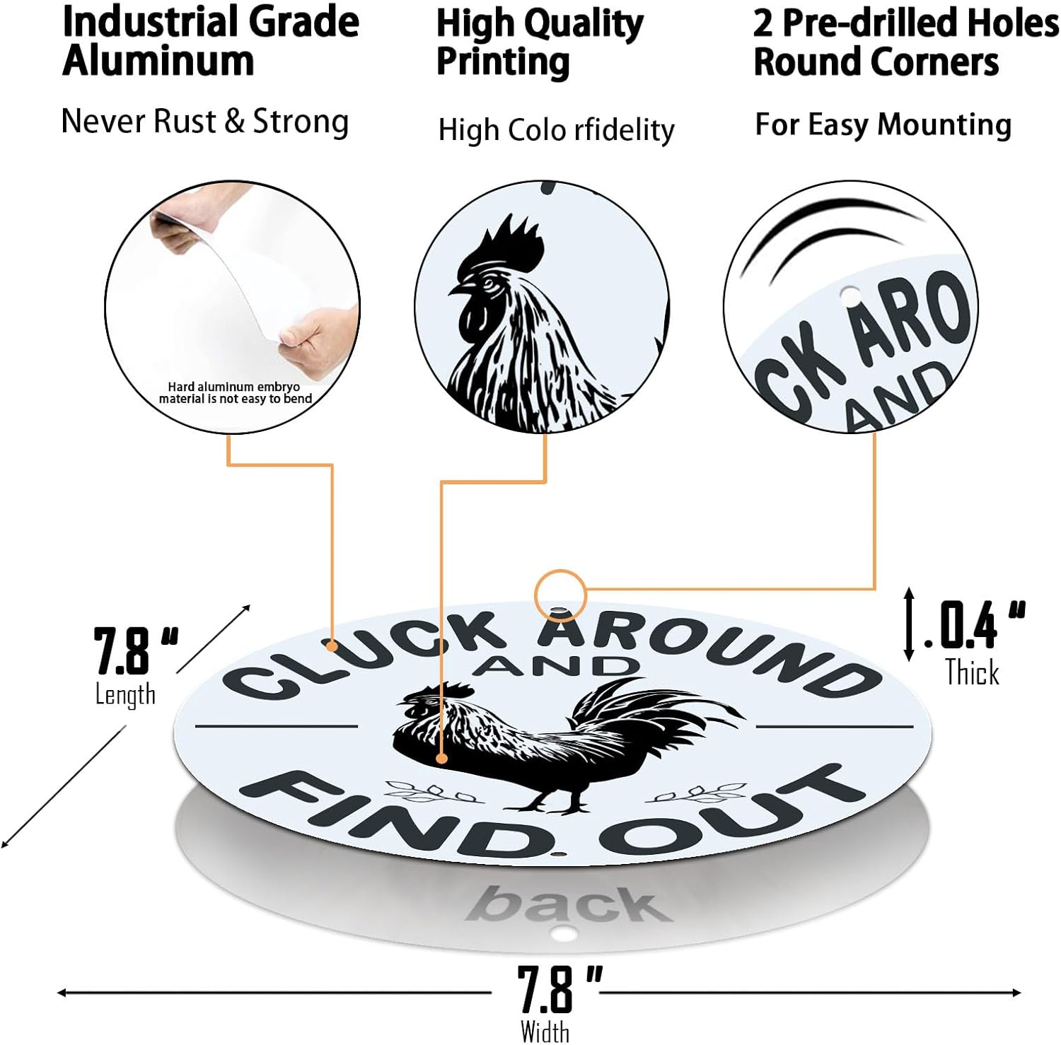 PRODUCT: Chicken coop sign.PACKAGING: Clear cellophane.FUNCTION: This comes wrapped in clear cellophane. It is circular and solid, although it has a little bit of flex to it. It measures 19.5cm across. It is silver on the rear with a painted design on the front, with a tiny pre-drilled hole a the top and bottom. The advert shows a good representation of the actual product.At the time of this review (August 2025) the chicken sign was £9.99. This is a nice little novelty chicken coop sign, with integrated mounting holes. I would recommend.