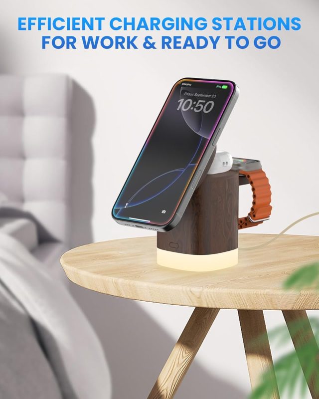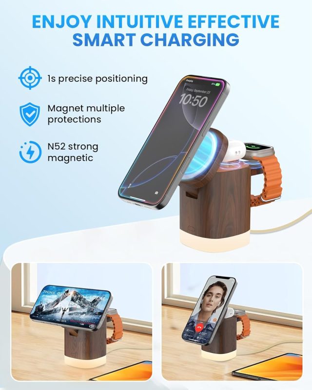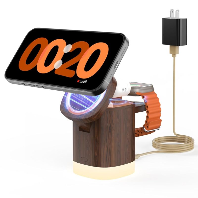 The JoyGeek 3-in-1 Charger Stand for MagSafe is a convenient wireless charging station that lets you charge your iPhone (12–16 series), AirPods (2–4), and Apple Watch (Series 2–10/Ultra) all at once. It uses strong magnets to keep your phone in place, making charging easy and reliable. The stand is foldable and lightweight, so it’s great for travel or keeping your desk tidy.It also features an adjustable night light with three settings, which is useful for bedside use. The build quality is sturdy, with a mix of metal arms and a plastic body that feels solid and not cheap. Users like that it reduces cable clutter and that the indicator lights turn off after a few seconds, so they won’t disturb you at night. Charging speed is decent—good for everyday use, but not the fastest available.Most people find it to be good value for the price, especially since it includes a wall charger and cable. However, some users have noted that the charging cable could be longer, and a few have experienced issues with long-term durability. Also, if your Apple Watch has a thick case, you may need to remove it for reliable charging