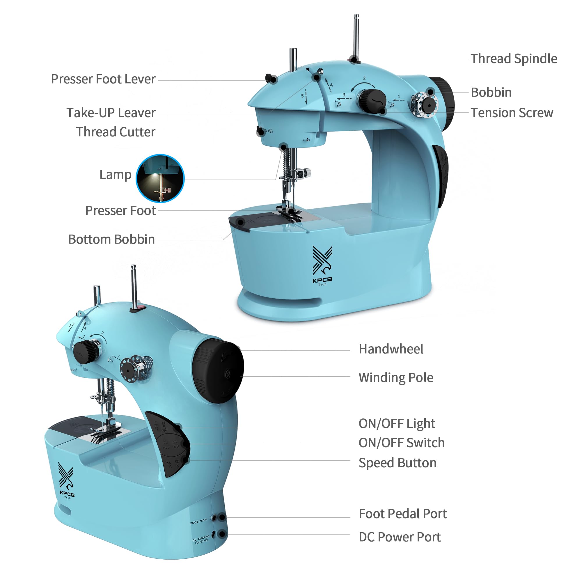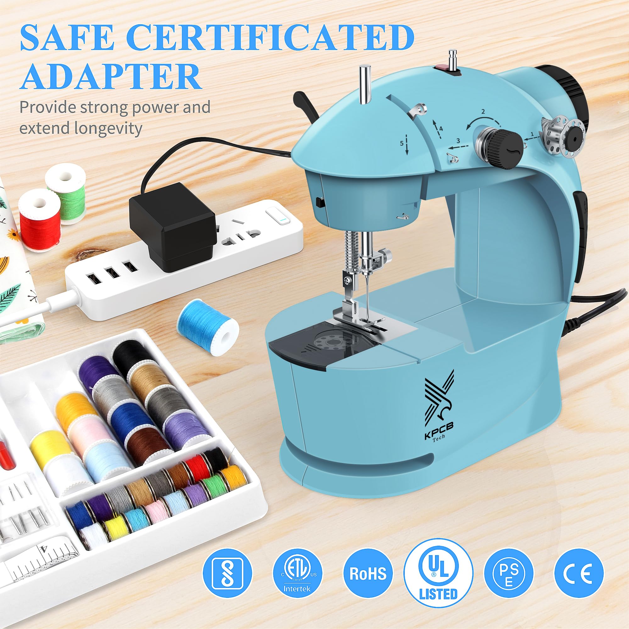 The KPCB Mini Sewing Machine comes with a 42-piece sewing machine kit, which includes various accessories such as bobbins, scissors, measuring tape, a thimble, a needle threader, and needles, as well as an extension table and foot controller.