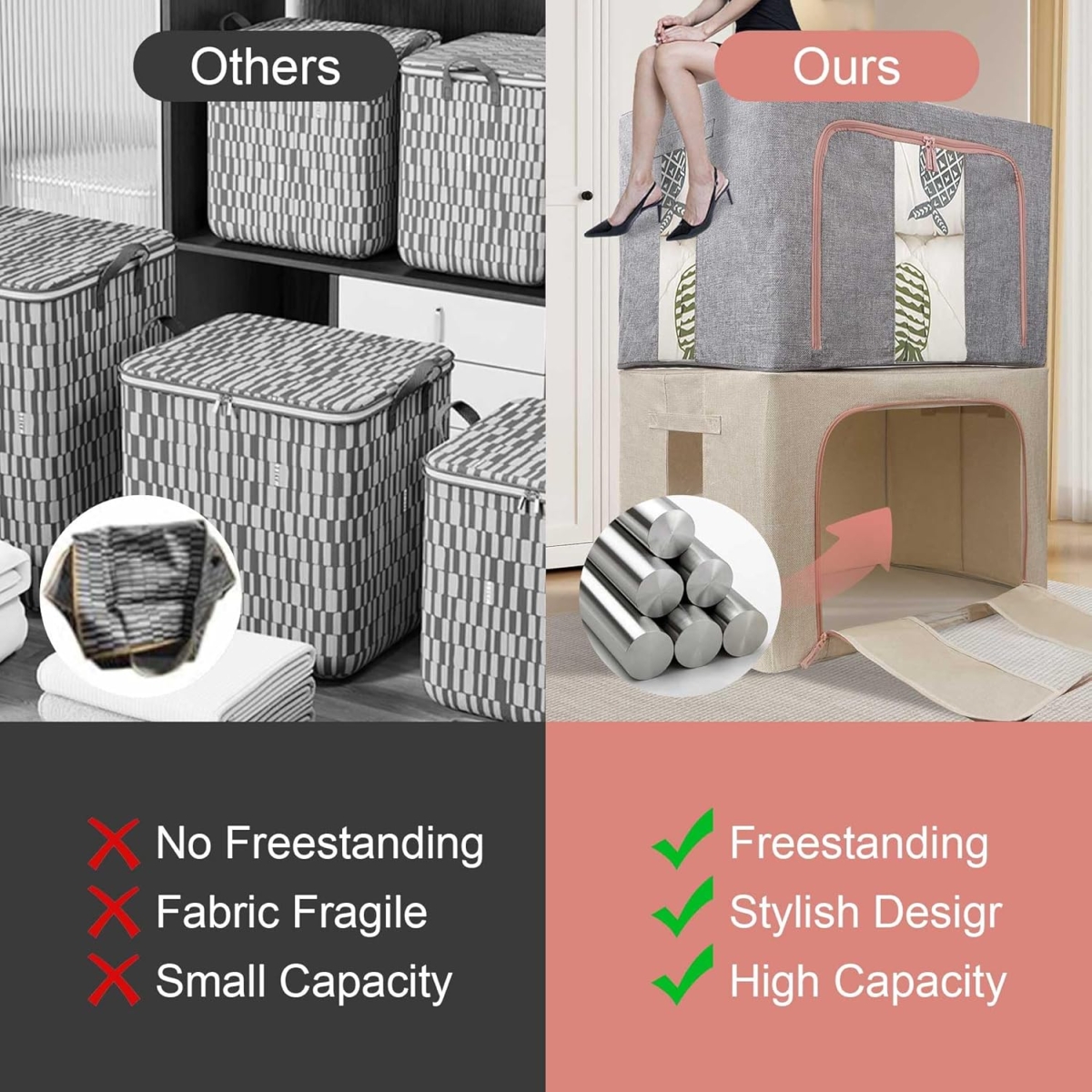 I needed strong storage boxes, and they had great reviews. I had a family crisis that needed dealing with very quickly, and found these to be totally perfect. They have metal bars that hold the sides up and one on the back, giving them strong support. The top is big enough for bulky items, and the front shows what is in there for easy access. Expensive but worth spending a little extra . For blankets and bulky items, the 66L is best