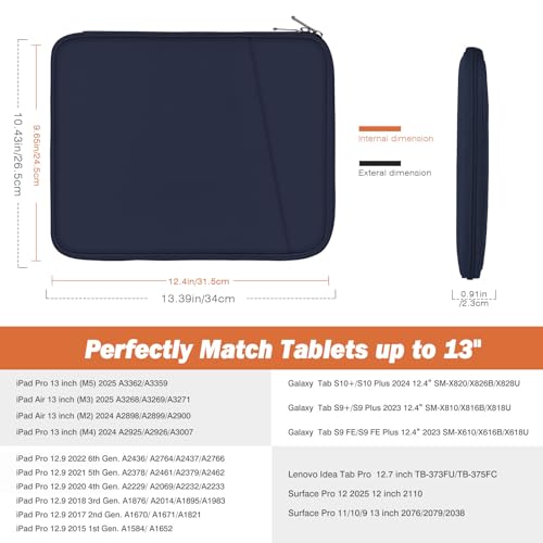 The MoKo 12.9 Tablet Sleeve Bag is compatible with various tablets up to 13 inches, including the iPad Pro 12.9″ (all recent generations), iPad Air models, Lenovo Tab series, Samsung Galaxy Tab series, and Microsoft Surface devices.