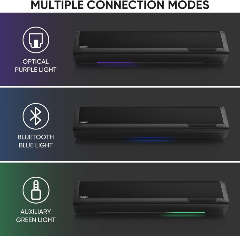 • Quickly identify input sources with color-coded lights, ensuring smooth transitions between Optical, Bluetooth, and AUX connections.
