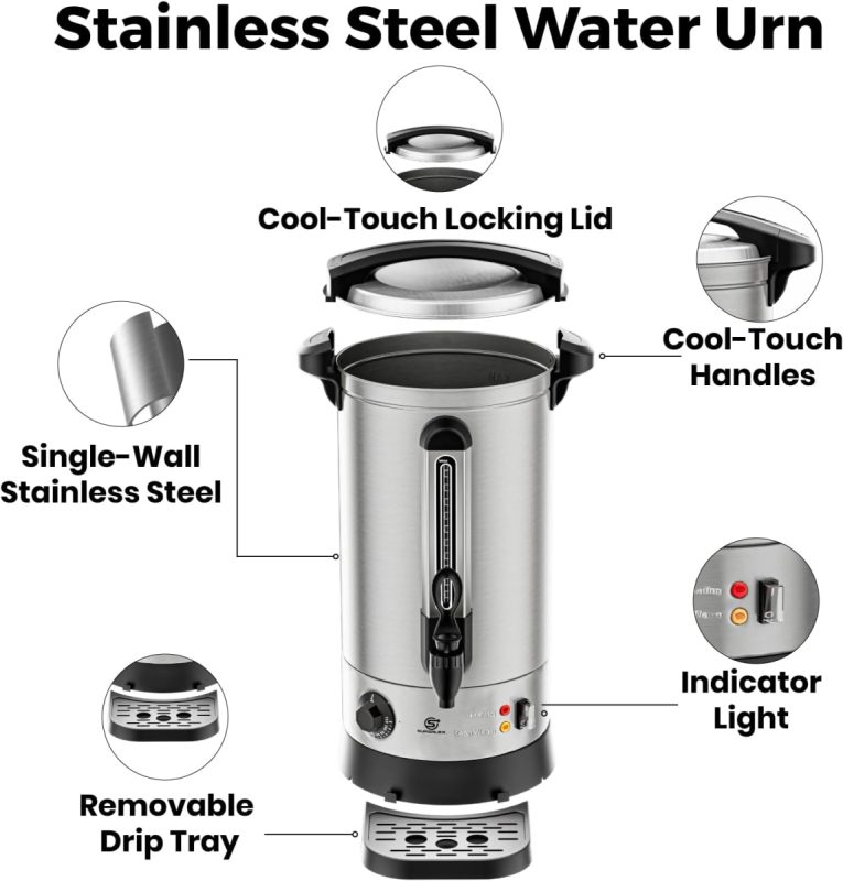 - Allow the urn to cool before cleaning; remove the drip tray and lid for easy maintenance.