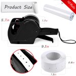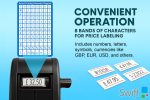 The price gun can print up to 8 digits per line and includes symbols such as £, €, and $.