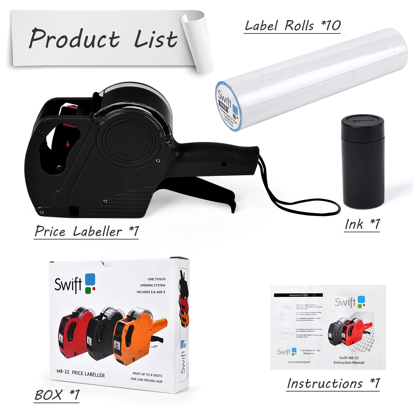 The kit includes a fully loaded price gun, 20mm spare ink, and 5,500 Swift 22×12 mm labels.