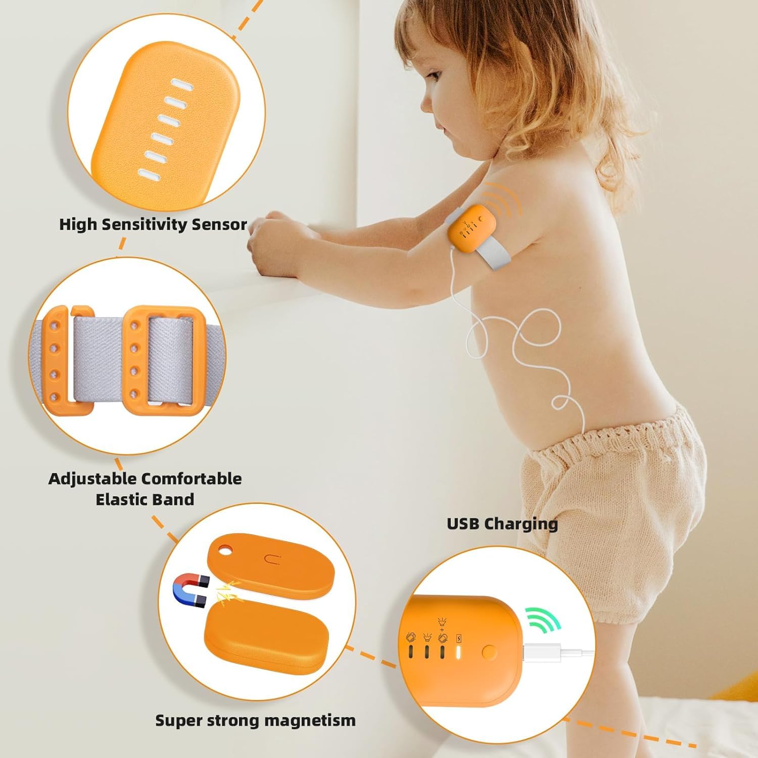 My toddler is day time potty trained and got this to make a start on night training, but has too many wires wrapping her up in her sleep I don’t feel is safe and feels more like a strangulation hazard. Might try a wireless version instead. No need to use these on babies, but good for a toddler who needs to wake up to use the potty in the night.