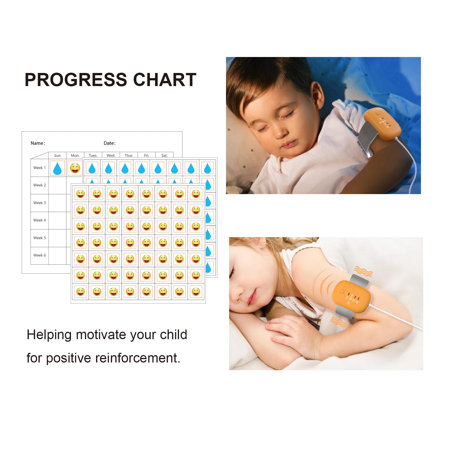 This device is a useful contraption to prevent bedwetting experiences and arrives neatly packaged in an informative box. Although it’s designed for sort of 3 year olds upwards as little ones progress from nappies to toilet trained – it can certainly be used by any age up with adults included. The premise is a simple one – if the sensitive sensor which is attached to a nappy to underwear is receptive of moisture being detected, it sets of an alarm designed to wake you up and stop any further harm to what may have already been started. The actual device is USB rechargeable with a cable provided to achieve this and the battery comfortably lasts for several nights at a time although I tend to recharge it daily anyhow. It straps around the arm or wrist in addition to the magnetic sensor that is attached further down which is an easy install. The alarm that goes off is in one of 3 modes between sound, vibration or both together which can easily be switched between and all work effectively. It nicely comes with a chart to record progress and reward little ones especially as they transition to nappy freedom so I’ve certainly been impressed at the simplicity and yet effectiveness of this device and what it delivers upon. It’s reasonably priced enough and neat looking so I can definitely recommend this.