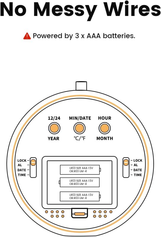 The clock looks good, is sturdy, and is a good size and weight. It has a large, warm yellow backlit display showing time, the date, temperature and set alarm time. The light comes on when the top snooze button is pressed. It does not stay on so does not disrupt sleep. The clock takes 3x AAA batteries and is fairly easy to set using the buttons and switches at the back. To set it, you simply slide the left side set of switches to either alarm, date or time. Use the buttons along the top to change hour, minute, month etc. You then have to slide the switch to lock position each time to confirm change. The clock has an alarm function with large snooze button at the top. The alarm is set or cancelled by sliding the right side set of switches to desired position. The alarm is not the loudest but I use this alongside my Alexa or phone alarm. So far it has kept pretty accurate time. I would buy again.
